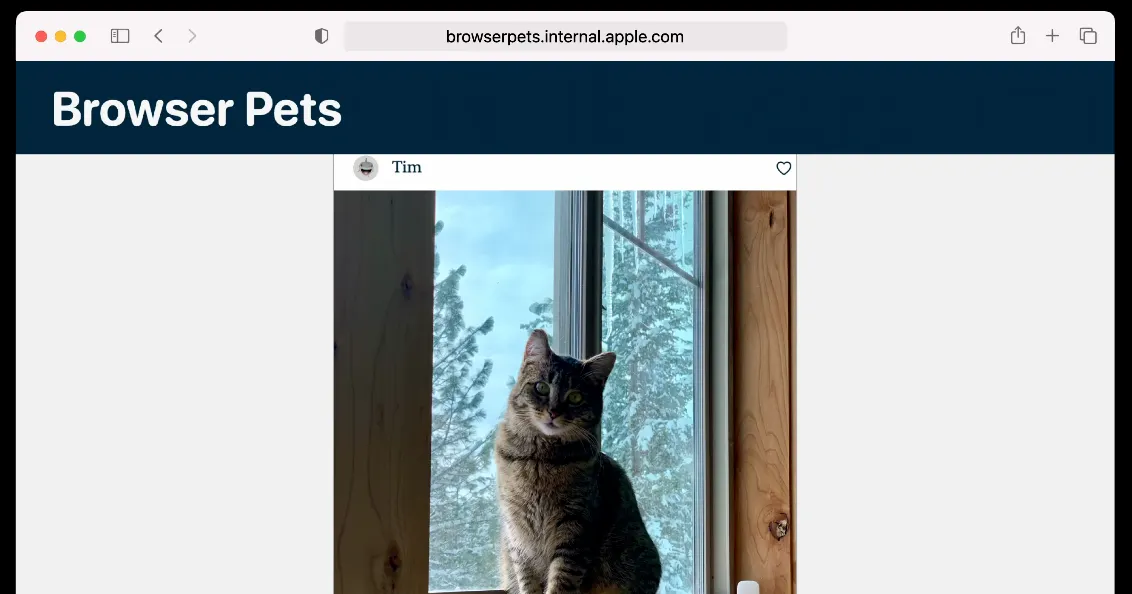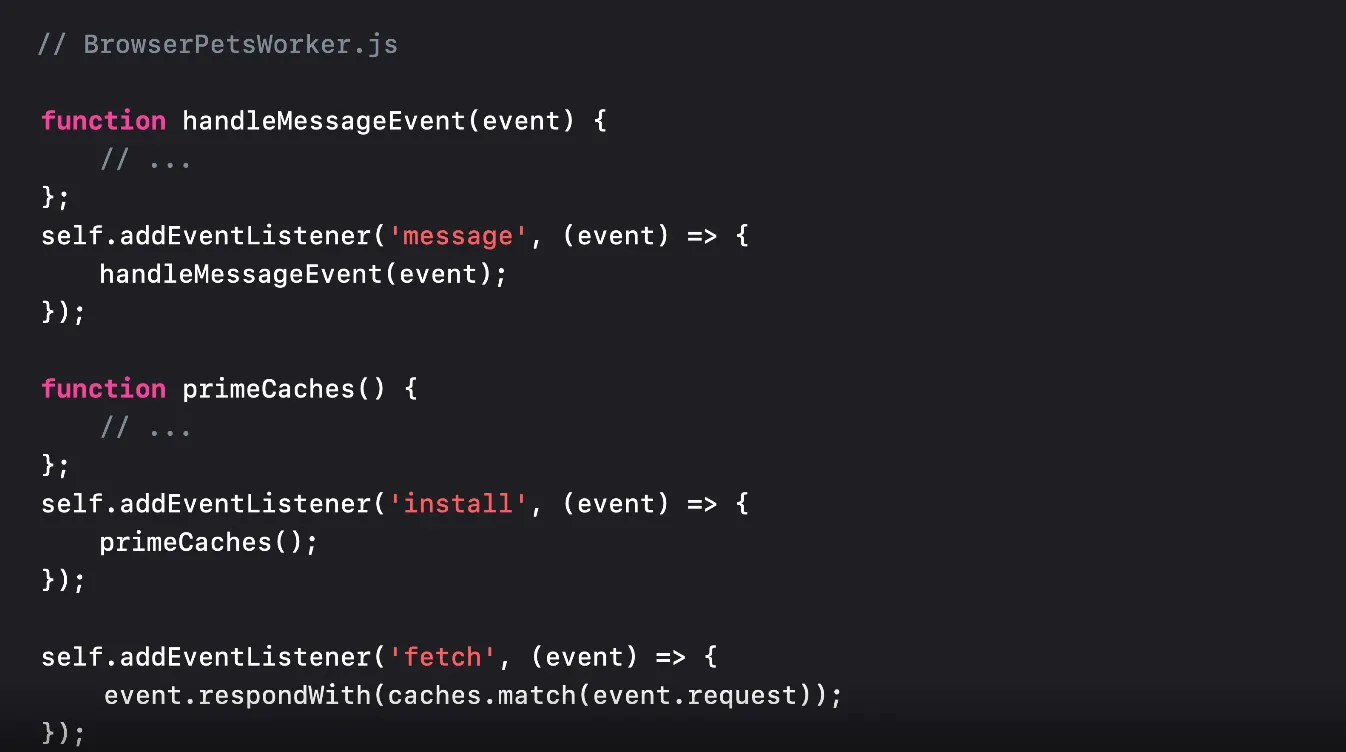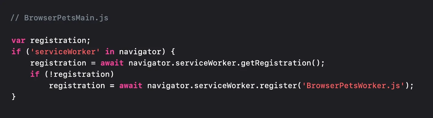엔지니어가 Browser Pets 페이지를 방문하면 이 JavaScript는 Service Worker 스크립트가