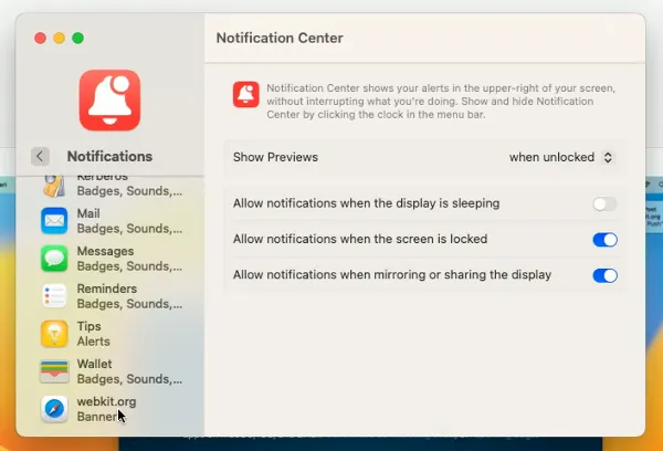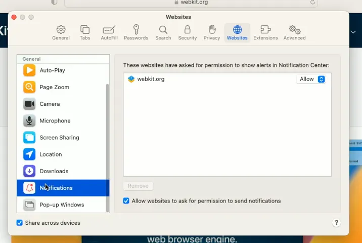 여기에서 webkit.org의 알림을 제어할 수 있어요.