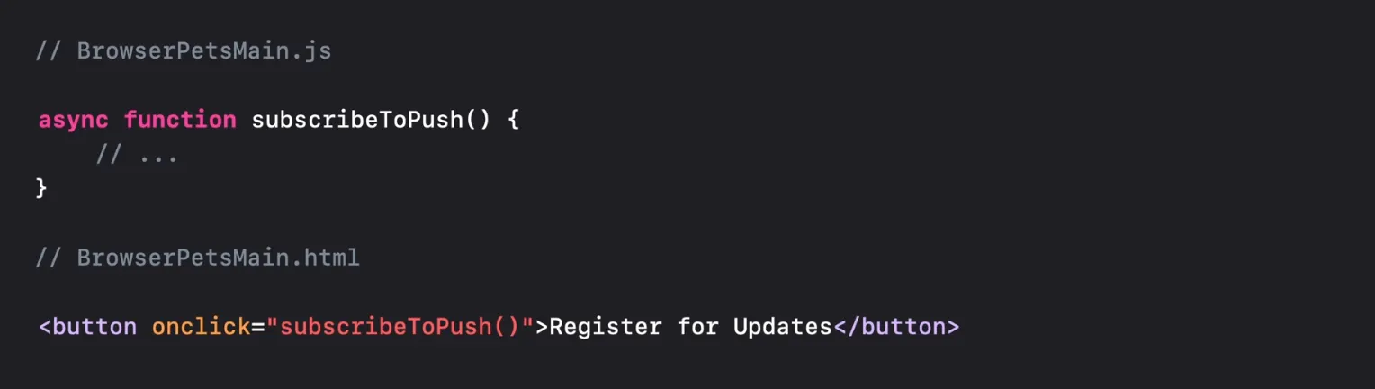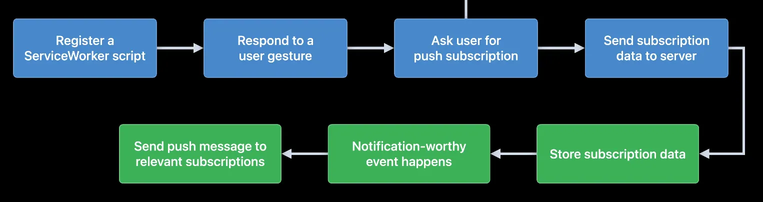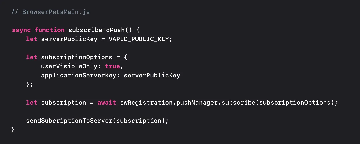 우리는 사용자가 요청하지 않은 구독 요청에 의해 스팸 처리가 되는 걸 원치 않아요. 따라서 웹 사이트에서는 푸시 구독 요청만 할 수 있음