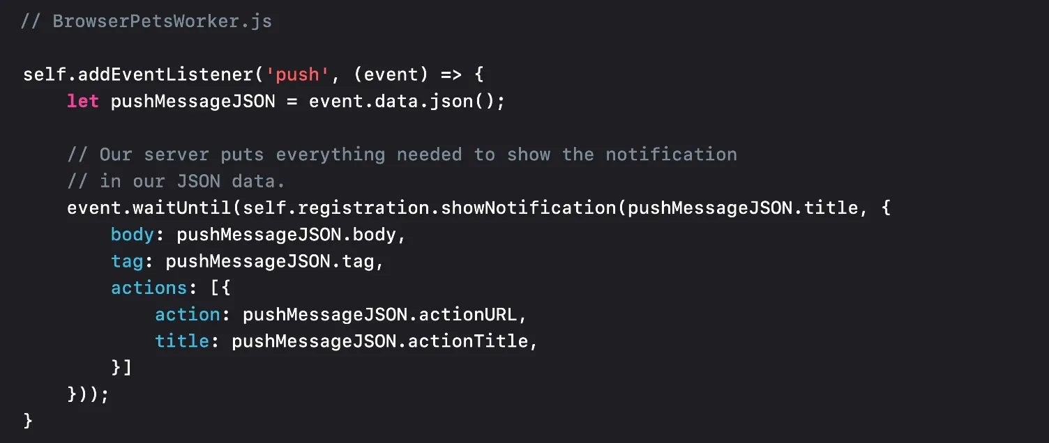 푸시 메시지가 Browser Pets 서버에서 다른 브라우저로 전송되면 Service Worker가 푸시 이벤트를 전송합니다.