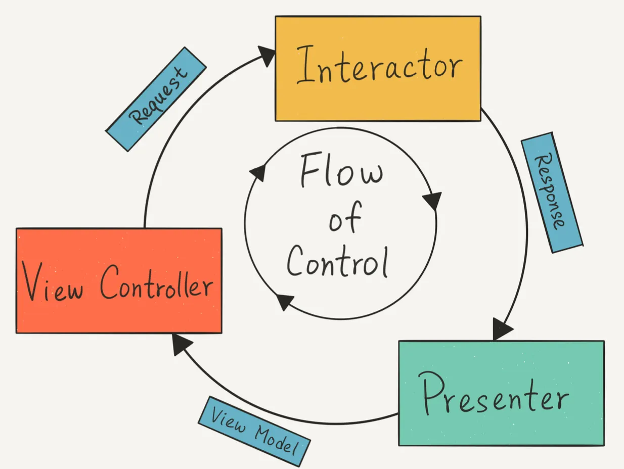 ViewController는 Interactor로 Request 모델을 전달하고, Interactor는 Presenter로 Response를 Presenter는 ViewController로 ViewModel를 전달하게 됩니다.