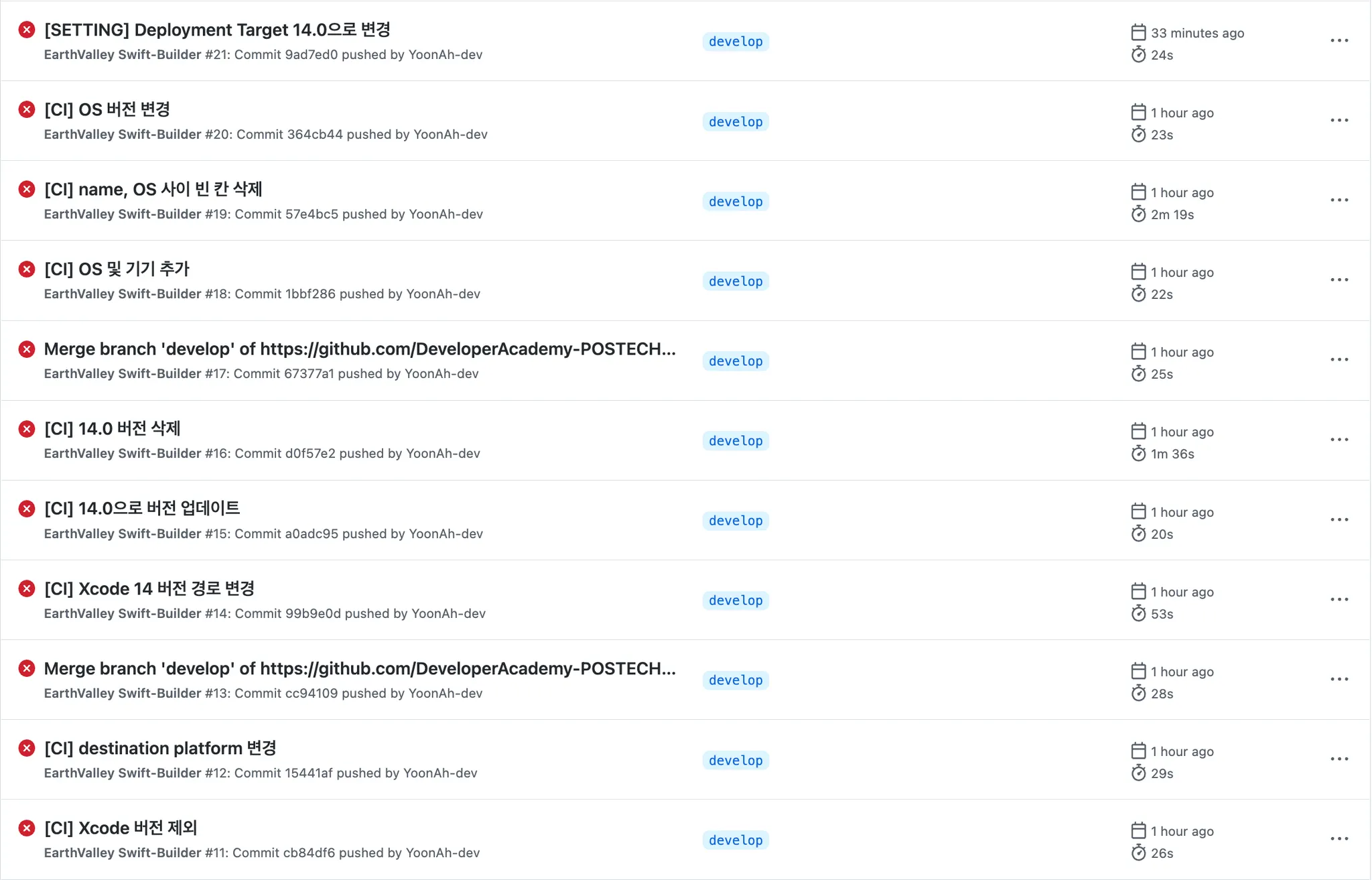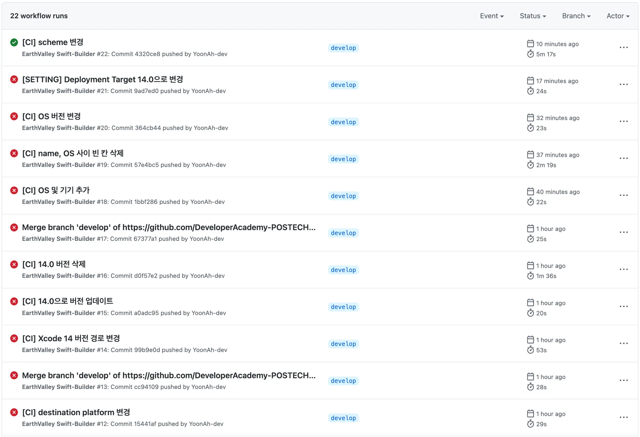22번의 workflow runs 끝에 Github Action build test를 성공한 내용입니다.
