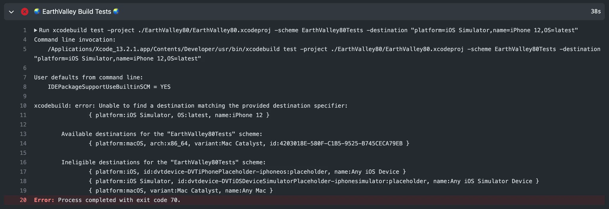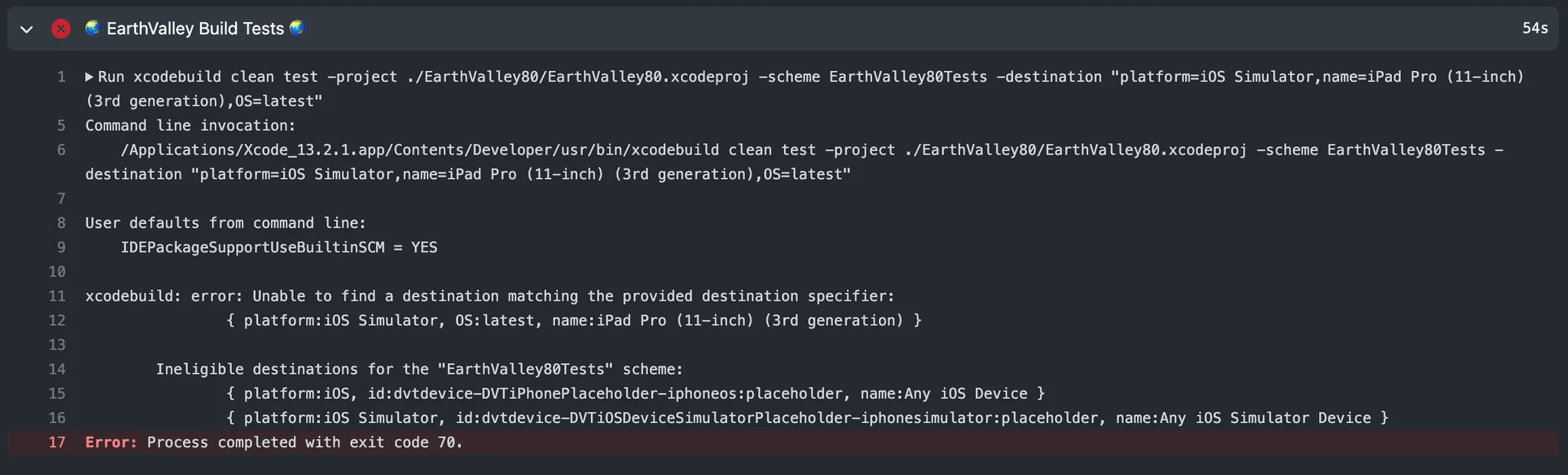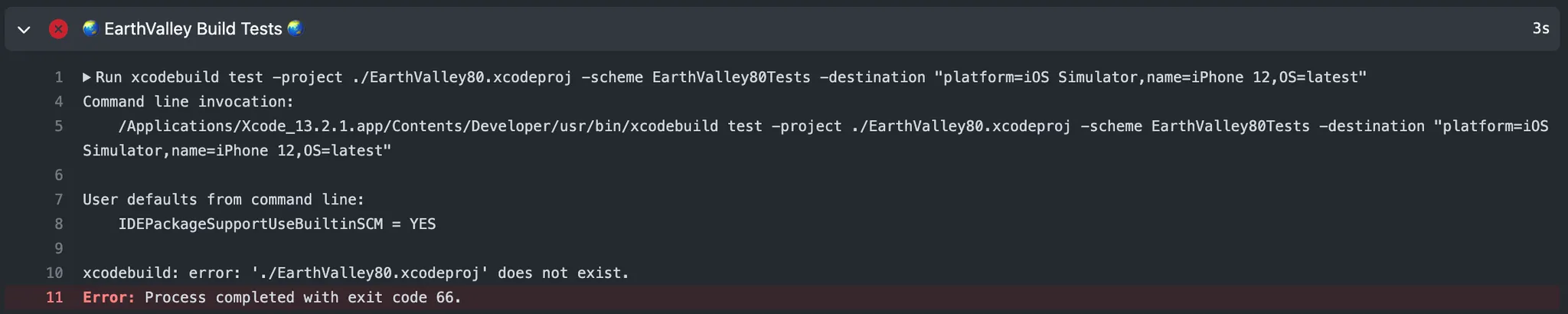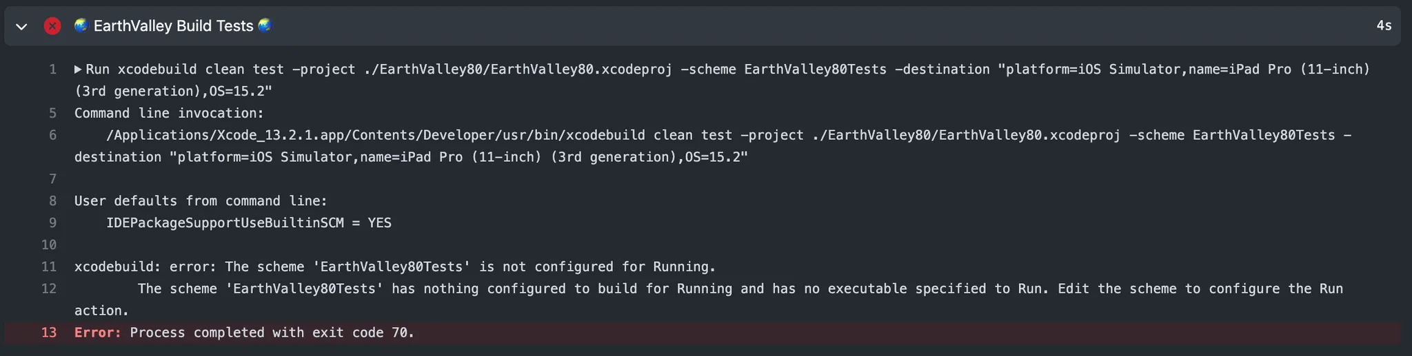 xcodebuild: error: The scheme ‘EarthValley80Tests’ is not configured for Running. The scheme ‘EarthValley80Test’ has nothing configured to build for Running and has no executable specified to Run. Edit the scheme to configure the Run action.