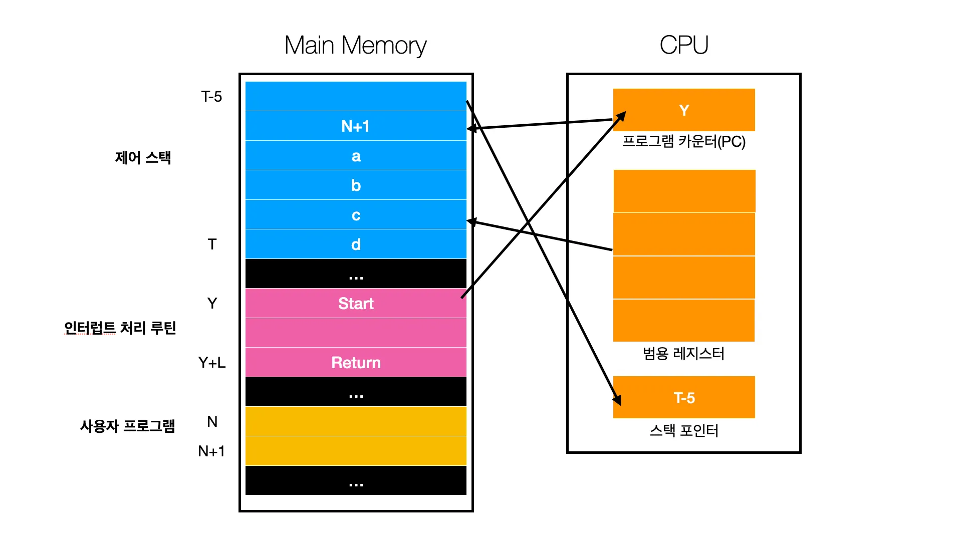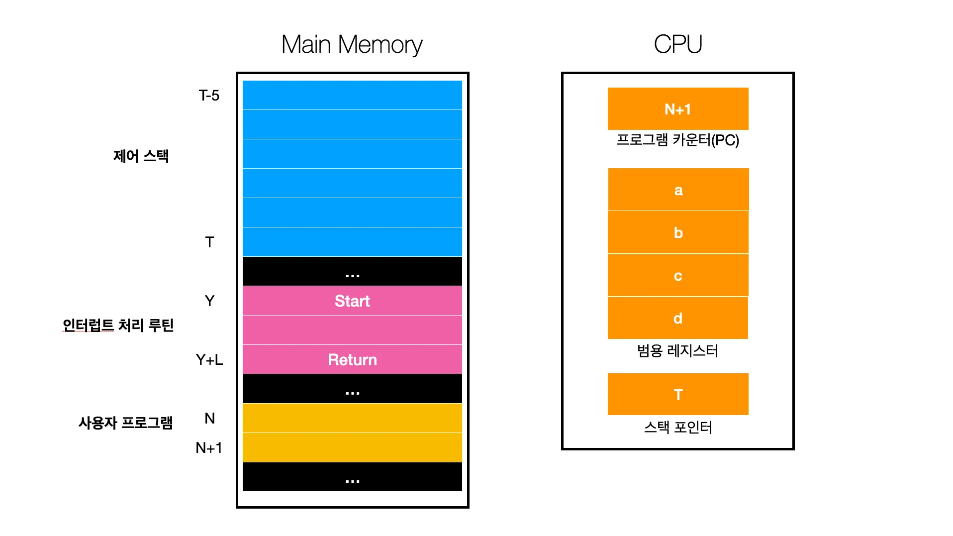 인터럽트 실행 이전의 CPU와 메인 메모리가 있습니다. CPU는 인터럽트를 처리하기 전에 현재 실행하던 프로그램의 정보를 메인 메모리의 제어 스택에 저장해둡니다.