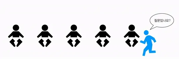 이런 상황에서 선생님은 학생에게 질문을 물어보는 시간을 적절히 정해야 합니다. 또한, 질문이 없던 친구가 선생님이 지나가고 나서 질문이 생기더라도 선생님이 다시 한 바퀴를 돌아올 때까지 질문을 말 할 수 없습니다. 그리고 선생님은 질문이 없는 친구들에게도 굳이 질문이 있냐고 물어봐야 합니다. 비효율적이죠.