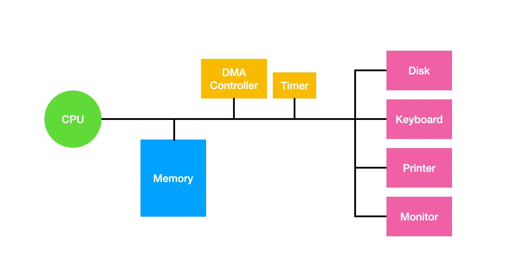 공통 버스(Bus)를 통해서 CPU, 메모리, 입출력 장치는 연결됩니다. CPU와 입출력 장치가 공통 버스를 통해서 연결되기 때문에 메모리 사이클을 놓고 경쟁하게 됩니다.
