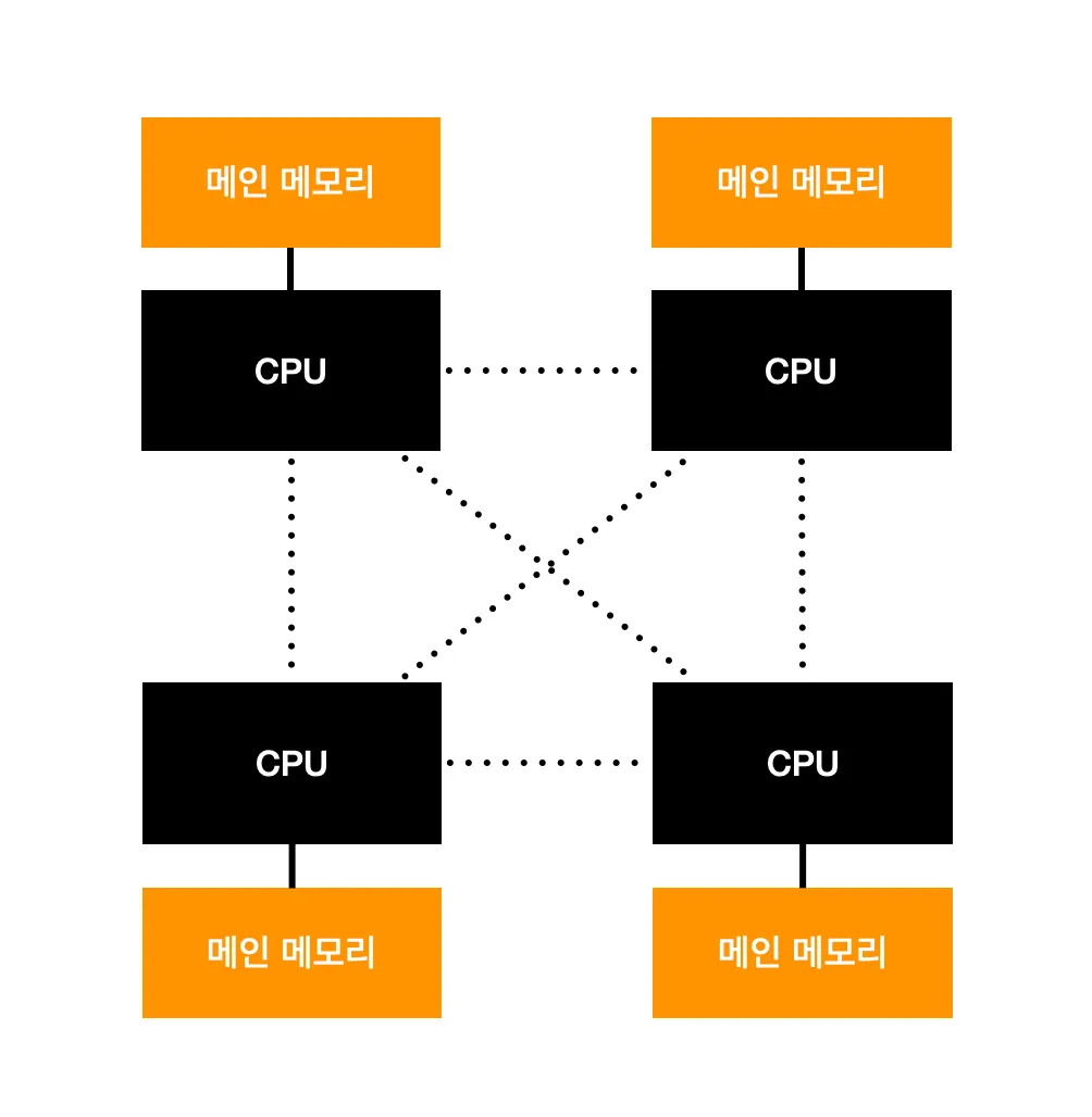 다중 프로세스 시스템은 CPU를 추가하면 컴퓨팅 성능이 향상되지만, CPU를 너무 많이 추가하게 되면 시스템 버스에 대한 경합이 병목 현상이 되어서 성능이 저하되기 시작합니다.