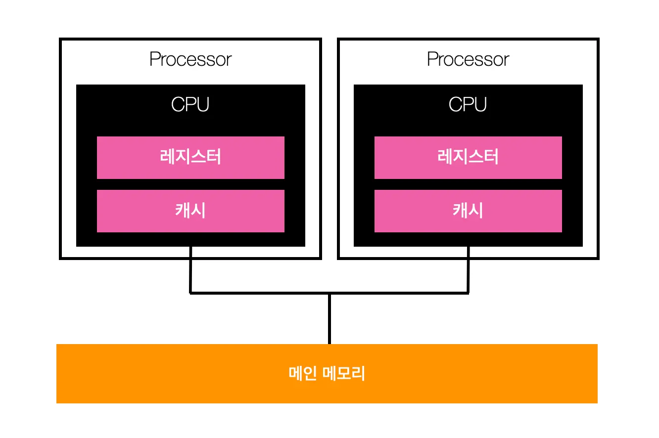 일반적인 다중 프로세스 시스템은 각 CPU 프로세서가 운영체제 기능 및 사용자 프로세스를 포함한 모든 작업을 수행하는 대칭형 다중 처리(SMP)구조입니다. 각 CPU 프로세서는 개별 또는 로컬 캐시뿐만 아니라 자체 레지스터 세트를 가집니다. 하지만, 컴퓨터 버스, 클록, 메모리 및 주변 장치는 공유하게 됩니다. 자원을 다양한 프로세서 간에 동적으로 공유할 수 있어서 프로세서 간의 작업 부하 분산을 낮출 수 있게 됩니다.