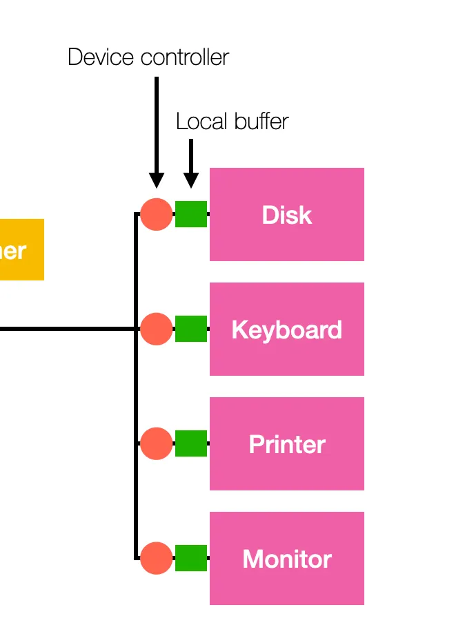 입출력 장치들은 장치들을 전담하는 작은 CPU같은 것들을 가집니다. 이 작은 CPU를 Device controller 라고 부릅니다.