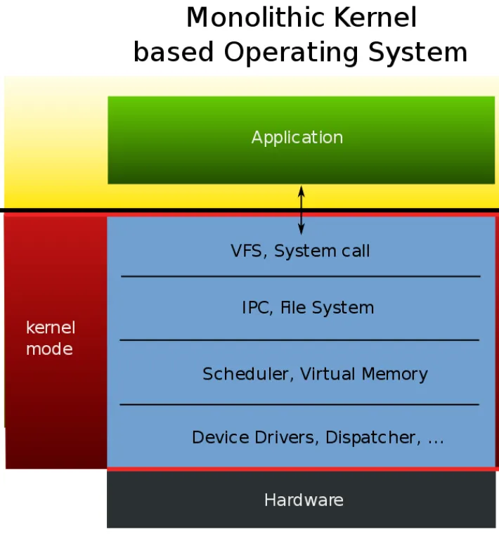 구조가 아예 없기때문에 커널의 모든 기능을 단일 주소 공간에서 실행하는 단일 정적 이진 파일에 넣습니다. 따라서, 단일 주소 공간에 엄청나게 많은 기능들이 들어가게 됩니다. 즉, 구현 및 확장이 어려운 구조입니다.