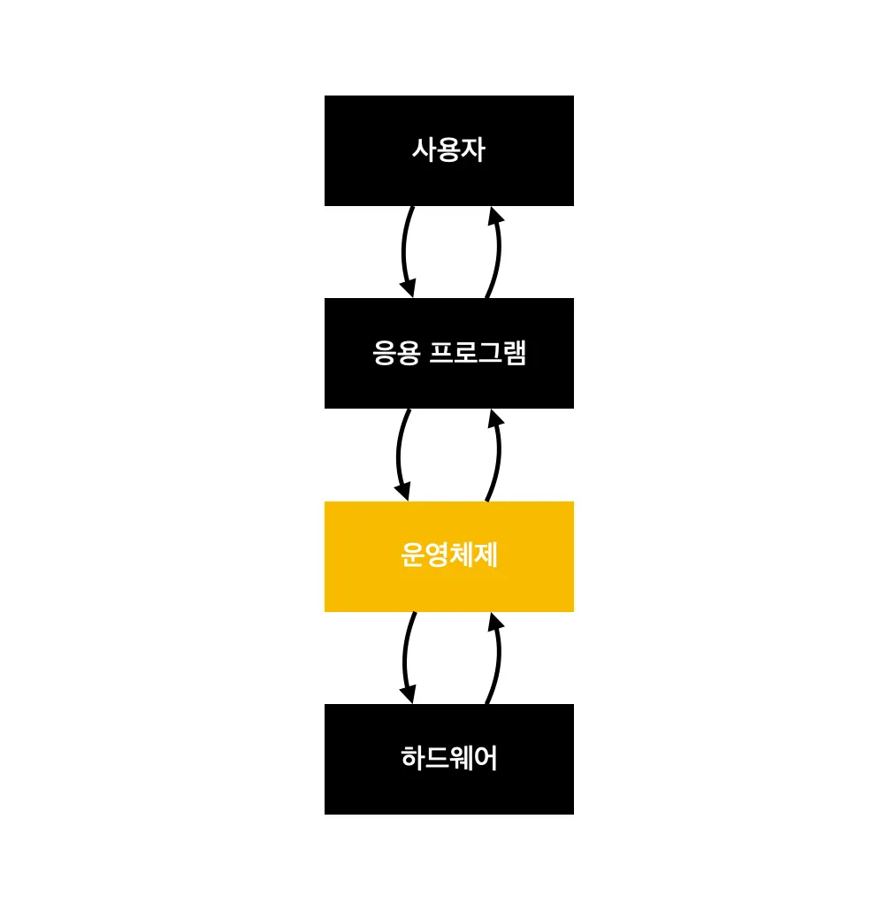 운영체제는 컴퓨터 사용자와 하드웨어 사이에서 중개자 역할을 합니다. 사용자가 프로그램을 편리하고 효율적이게 수행할 수 있는 환경을 제공해주면서 하드웨어를 관리해주는 소프트웨어 입니다.