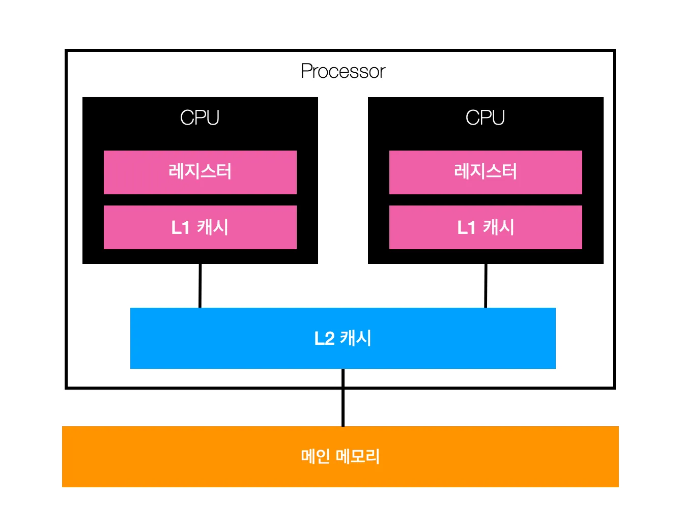 여러 개의 코어가 단일 프로세서(칩)에 상주하는 시스템입니다. 다중 코어 시스템은 다중 프로세서 시스템이 발전한 형태입니다.