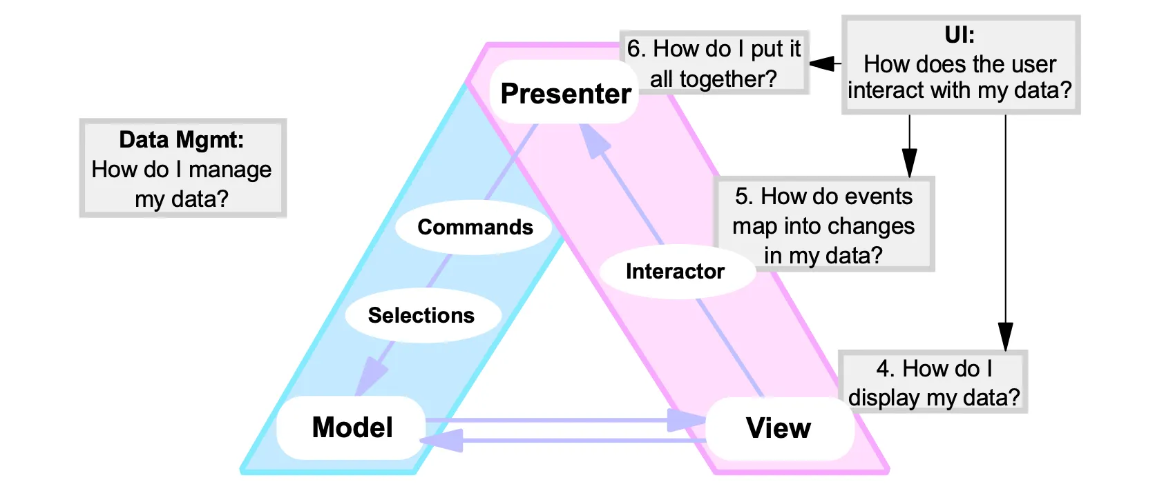 Presenter는 Interactor를 통해서 이벤트와 제스처를 해석해서 의도한 방식으로 모델을 가공하기 위한 적절한 Command에 매핑을 합니다. Presenter가 사용자가 데이터와 상호작용하기 위한 Interactor와 데이터를 관리하기 위한 Command의 역할을 적절한 섞어서 가지고 있다고 보시면 될 거 같습니다.