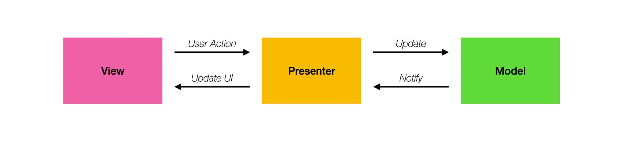 MVP 패턴의 기본적인 틀은 이러합니다. View가 사용자의 액션을 받아서 이를 Presenter에게 넘겨주고 Presenter는 Model를 Update 시키고 Update된 모델을 다시 화면에 띄워주도록 합니다.