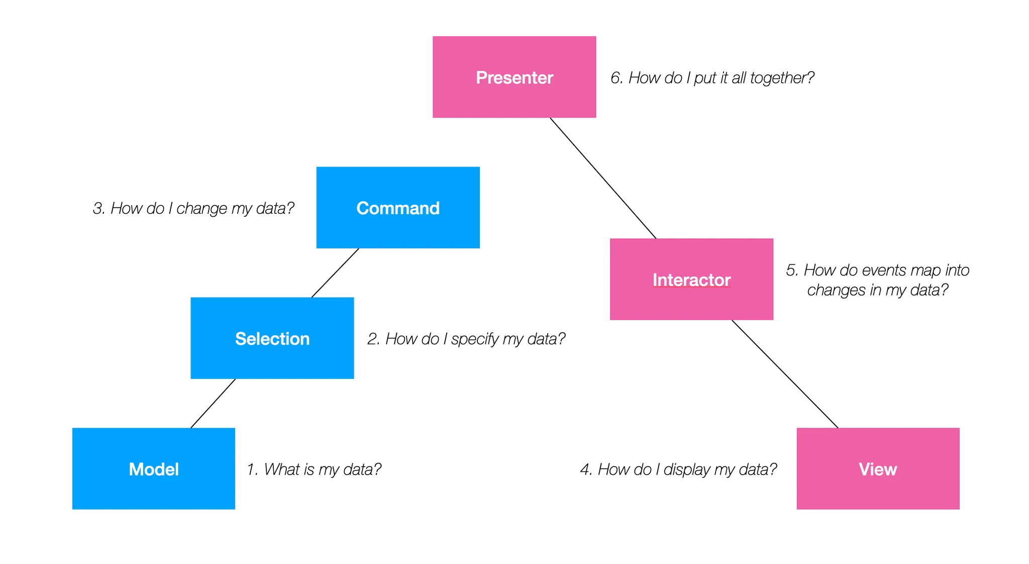 그리고 두 가지 개념에 대한 답을 6가지 질문으로 풀어냅니다. Taligent는 6가지의 질문이 프로그래머가 MVP 기반의 프로그램을 설계할 때 고려해야 하는 부분으로 봅니다.
