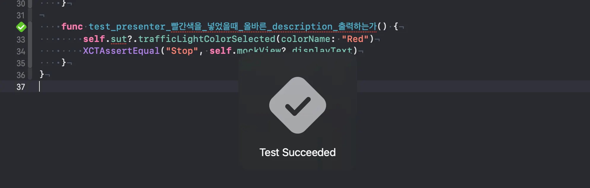 그리고 올바른 description인 “Stop”과 mockView 안에 있는 displayText가 같은 값을 나타내는지 확인할 수 있게 XCTAssertEqual를 사용해서 값을 비교했습니다.