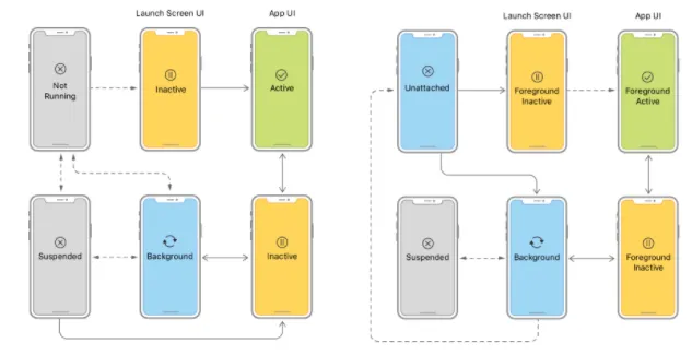 생명주기가 조금 다릅니다. 오른쪽이 AppDelegate, 왼쪽이 SceneDelegate입니다.
