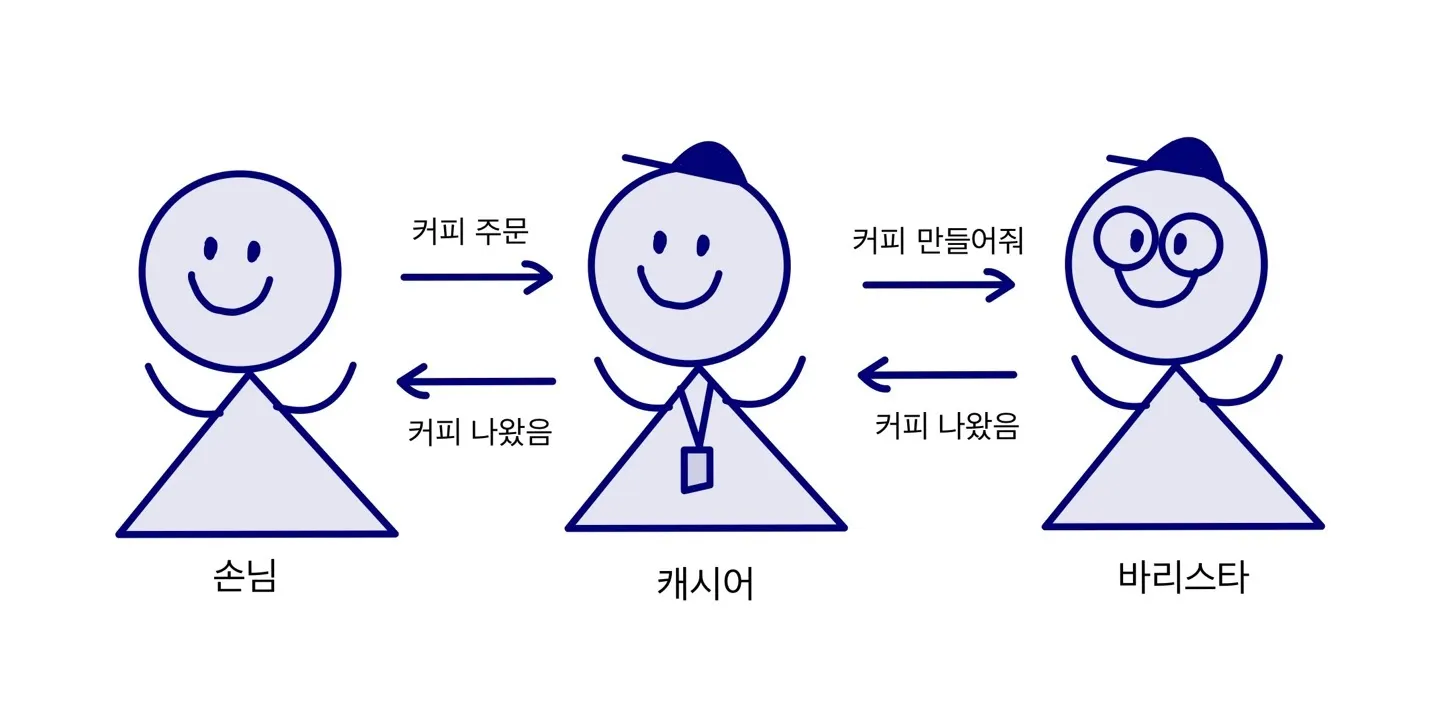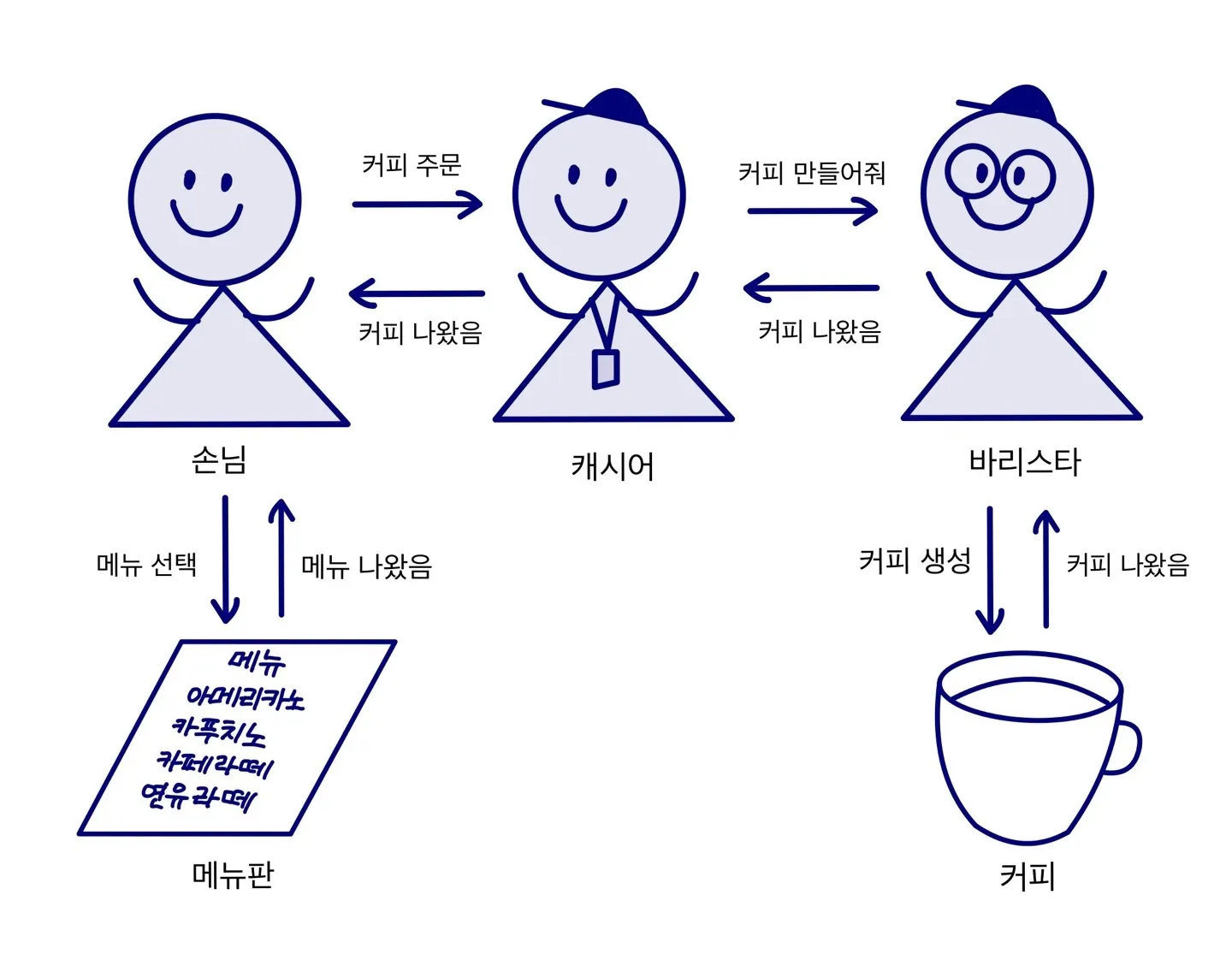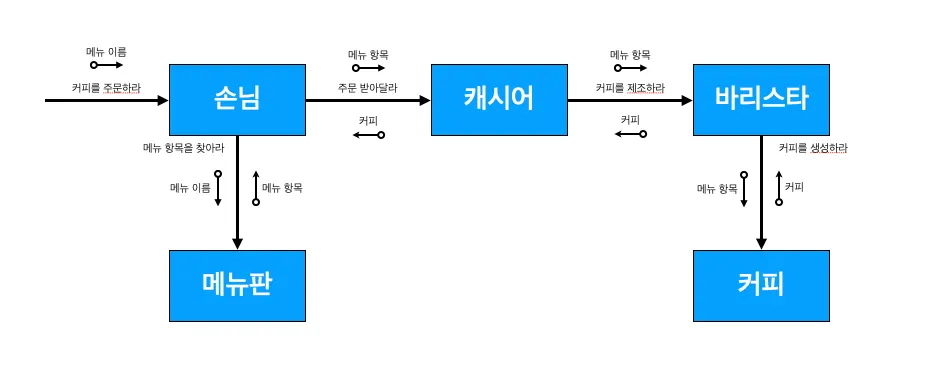 Cashier는 Customer에게 메뉴 항목으로 주문을 받습니다. 주문을 받은 Cashier는 해당 주문을 Barista에게 넘기고 Barista에게 Coffee를 받아서 Customer에게 넘겨줍니다.