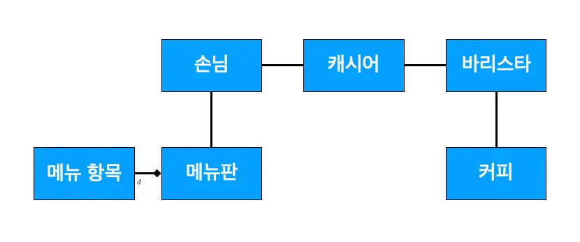 먼저, 각각의 관점에서 보기 전에 그들이 어떤 협력 관계를 가지고 있고, 어떤 역할과 책임을 가지고 있었는지 얘기해봅시다. 그리고 손님, 캐시어, 바리스타의 협력을 잘 나타내기 위해서 몇 가지 객체들을 더 추가해볼게요.