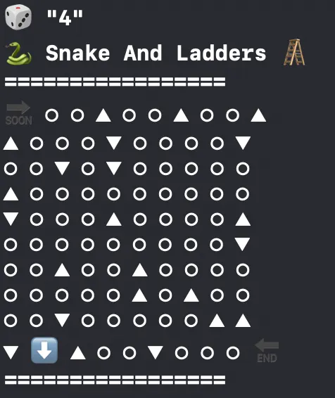 이렇게 하면, 보드판이 출력됩니다. 현재 위치와 어디에 사다리가 있고 뱀이 있는지 확인할 수 있습니다.