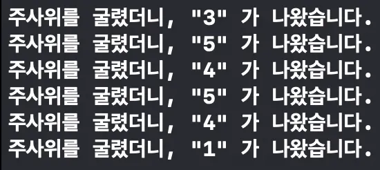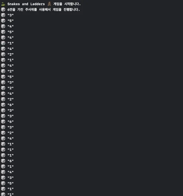 하지만, 아직 주사위만 냅다 굴리는 게임 같지 Snakes and Ladders 게임 같진 않네요. 출력되는 문장을 좀 더 깔끔하게 정리해보겠습니다.