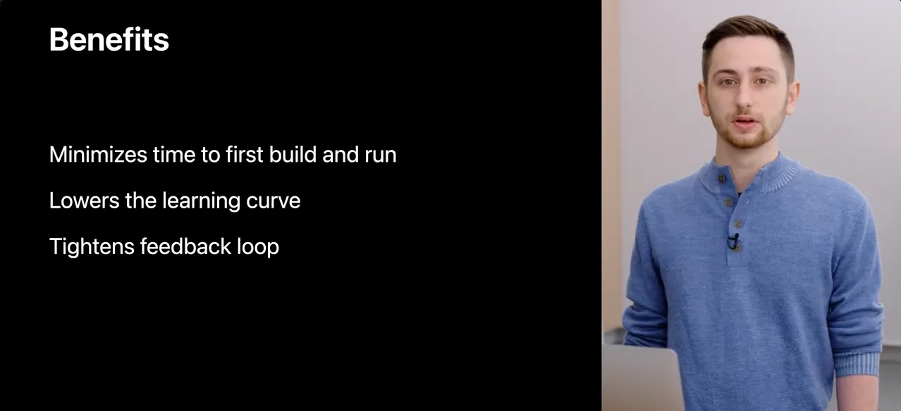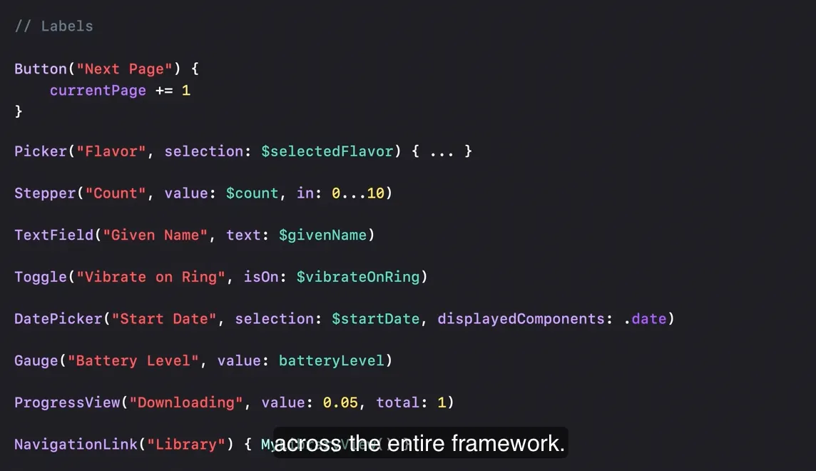 Common use case 사례를 간결하게 만들기 위해 명시적으로 구체화하지 않는 Intelligent defaults를 제공합니다. SwiftUI 전체에서 가장 많이 사용되는 API를 발견할 수 있을 겁니다.