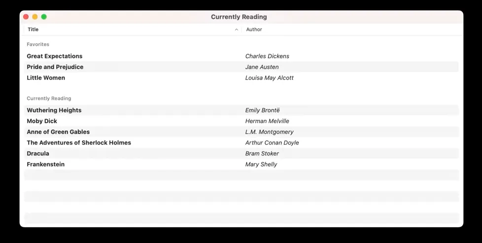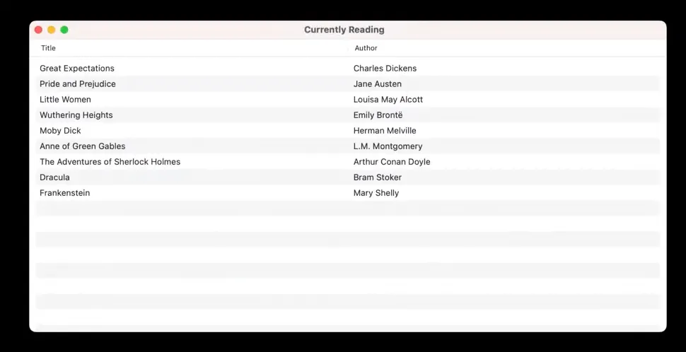 이 표는 현재 읽는 책을 열거하고 있어요. 각 책에 대한 행도 만들고 있습니다. 다음에는 각 행의 데이터를 열에 배치하는 방식을 명시합니다. 표에는 제목 열과 작가 열이 있네요.