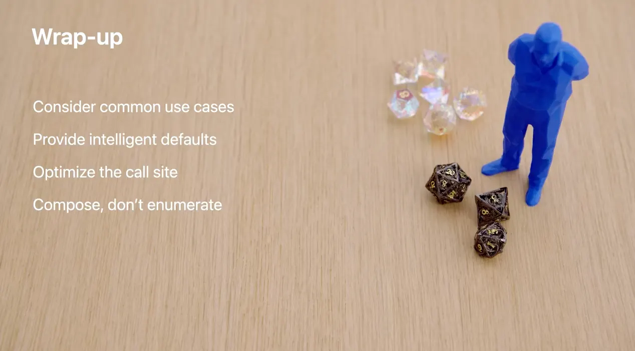 일반적인 케이스만 열거하고 편의성을 제공하지 않는다면 API를 구성할 수 있는 조각으로 나눠서 해결책을 만들어보세요!
