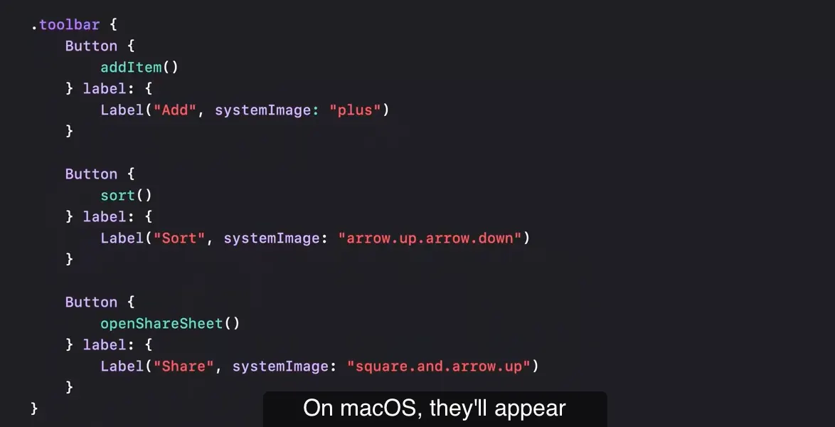 macOS에서는 Toolbar가 왼쪽에 나타나지만 iOS에서는 내비게이션 바에 나타납니다. watchOS에서는 첫 번째 항목만이 내비게이션 바 아래 고정돼어 있어요.