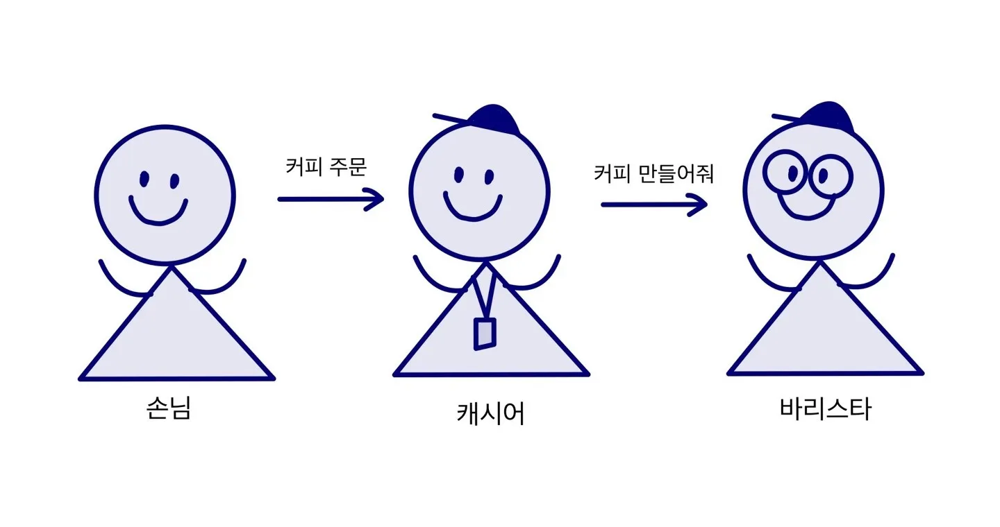 손님은 캐시어에서 주문을 통해서 커피를 줄 것을 요청합니다. 캐시어는 바리스타에게 커피를 만들 것을 요청합니다. 손님이 캐시어에서, 캐시어가 바리스타에게 요청을 한 이유는 스스로 해결하지 못하는 문제이기 때문입니다.