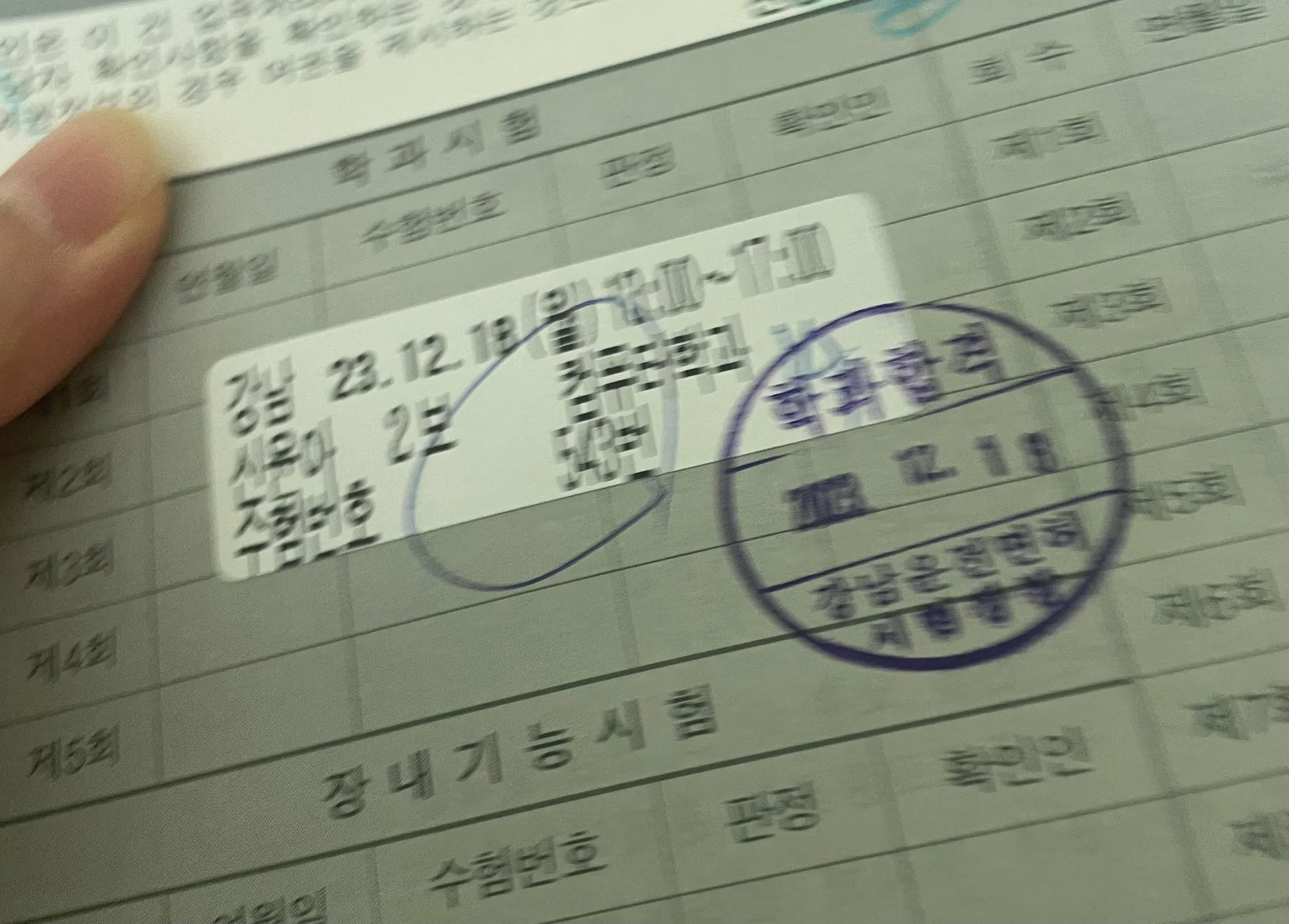 필기본 날 바로 학원 등록을 했습니다. 필기 시험과 같은 주 토요일에 학과 수업을 듣고 그 다음주에 기능 교육을 4시간 들었습니다. 그리고 12월 29일 장내 기능 시험을 100점으로 합격했습니다.