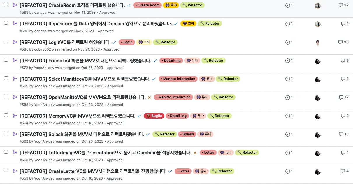 현재는 MVVM 구조에 Combine를 사용해서 비동기 이벤트 처리를 하고 있습니다. 이전에 Delegate를 사용해서 개발한 코드보다 이해하기 쉽고 간결한 코드가 되었습니다. 요즘 디버깅하면서 이전보다 문제 위치를 훨씬 빨리 찾아낸다는 걸 많이 느낍니다. 또한, 리팩토링하면서 동일한 컨벤션으로 전체적인 코드를 정리했는데, 코드 이해 속도가 많이 빨라졌다는 생각이 듭니다.