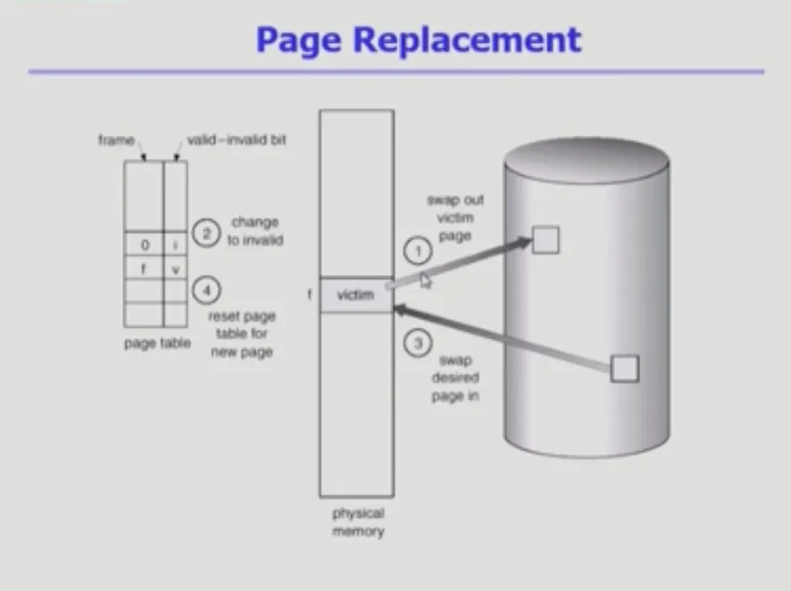 만약 비어있는 페이지 프레임이 없고 꽉 차있다면 빈 페이지를 하나 획득하기 위해 하나를 쫓아내야 한다.(replace) |