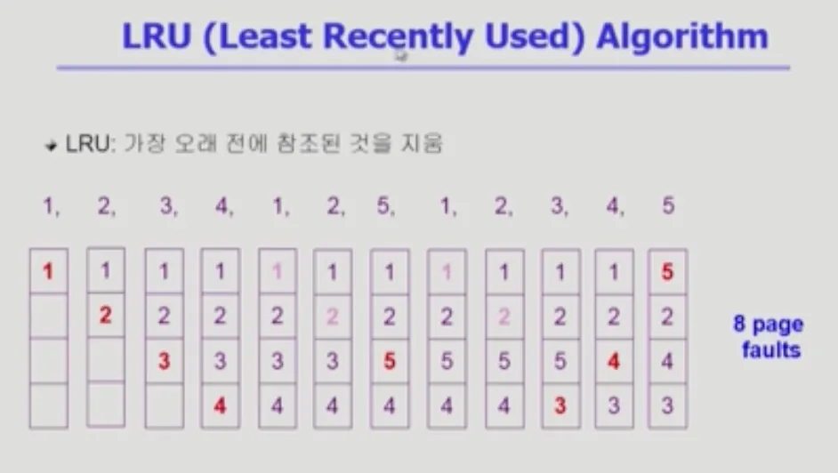 가장 덜 빈번하게 사용된 페이지를 쫓아내는 알고리즘