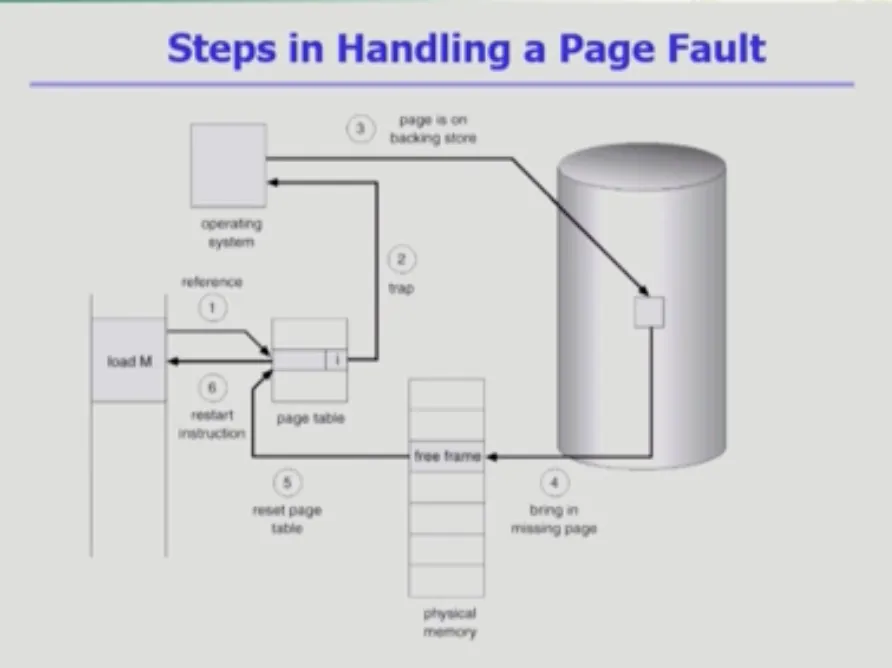 5. OS가 cpu를 가지고 fault나는 페이지를 메모리에 올리는 작업 진행함(소프트웨어 interrupt) |