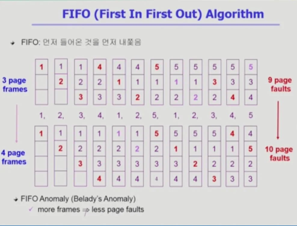 메모리 프레임을 늘렸는데 성능이 더 나빠지는 현상으로 FIFO Anomaly 라고 불립니다.