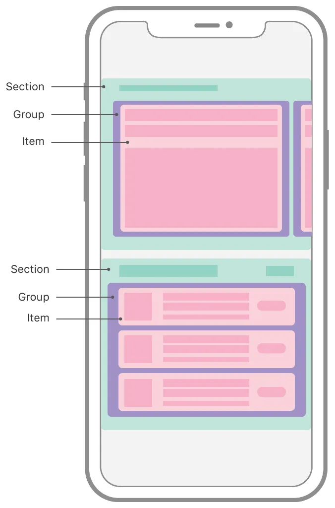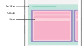 그림에서 보시다시피 Compositional은 별개의 시각적 그룹으로 나누는 하나 이상의 Section를 가집니다. 각 Section은 표시할 데이터의 최소 단위인 개별 item Group를 만듭니다. Group은 Horizontal, Vertical 또는 Custom한 배열로 배치가 가능합니다. Group안에 배치되는 건 item입니다.