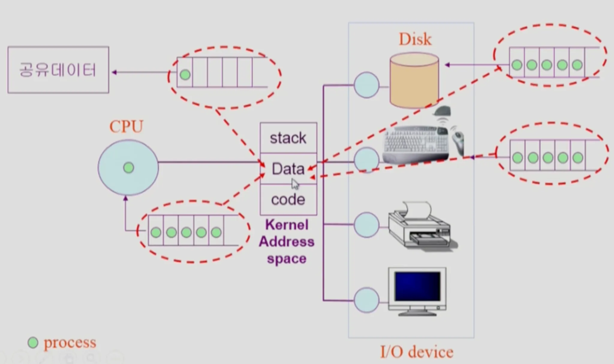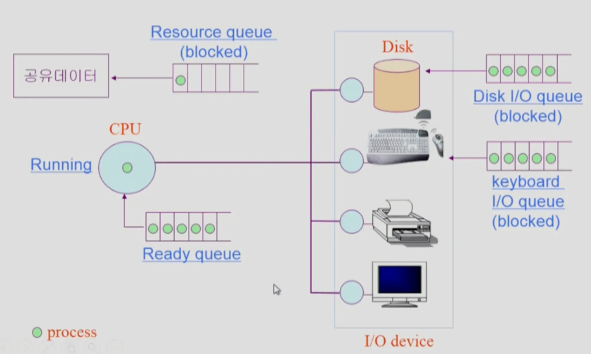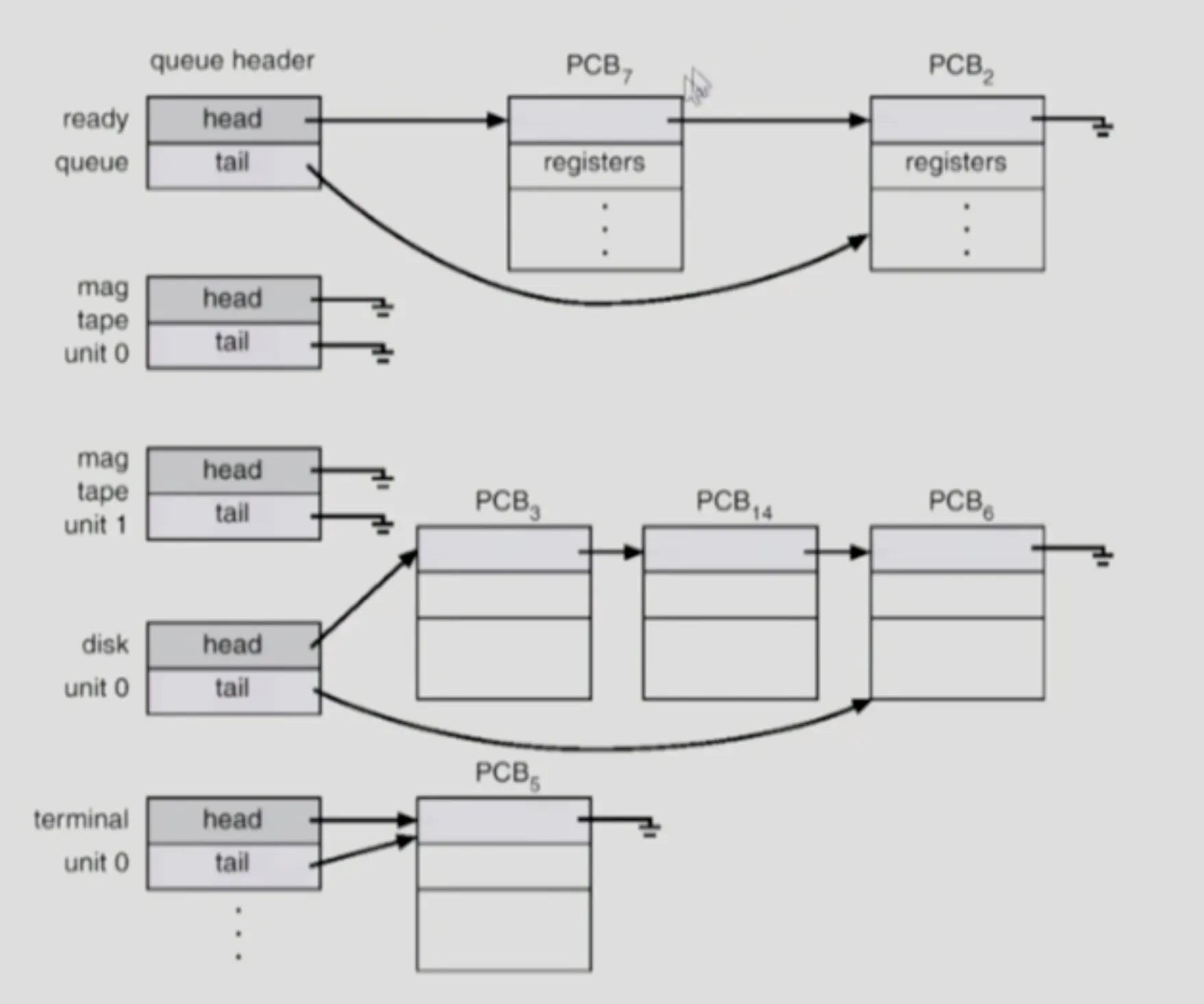 Device queues : I/O device의 처리를 기다리는 프로세스의 집합