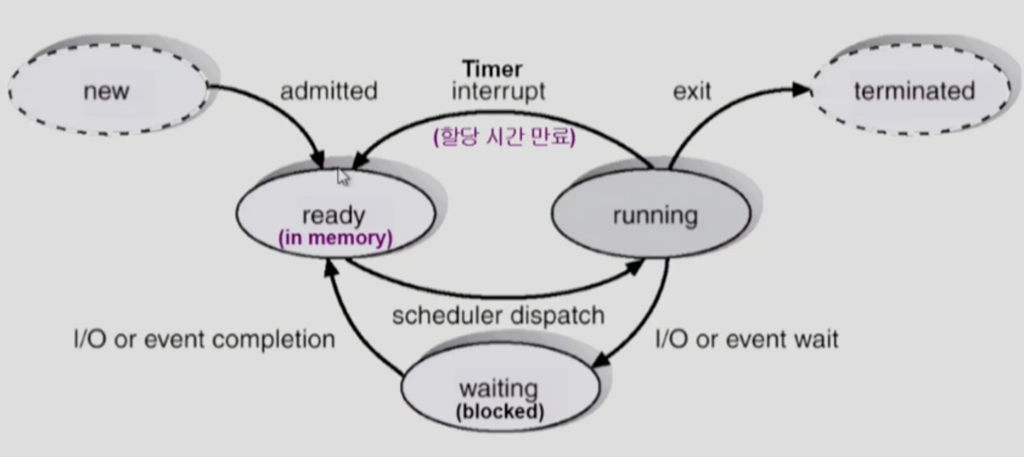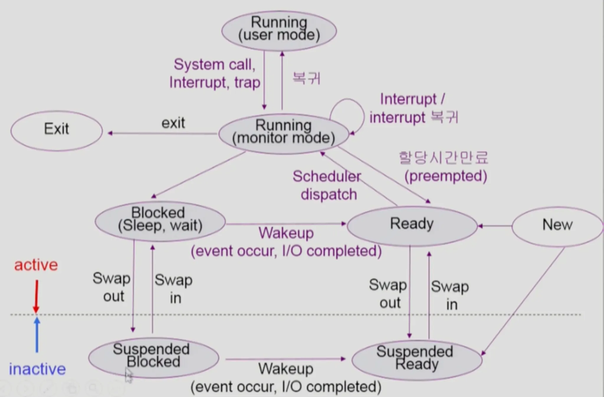 Blocked(wait, sleep) : CPU를 주어도 당장 Instruction을 수행할 수 없는 상태