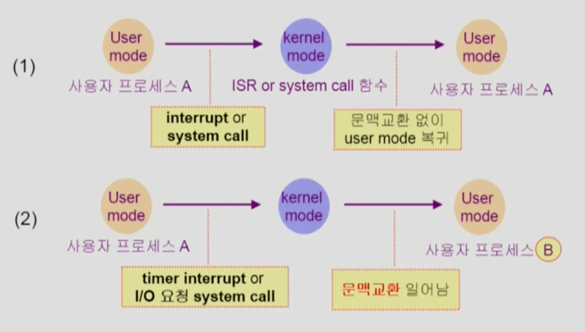 eg. cache memory flush : 상당한 오버헤드. A에서 B로 넘어가게 되면 사용하던 캐시 메모리를 모두 지워야 한다. User mode와 Kernel mode를 왔다갔다 하는 상태에서는 그렇게 하지 않아도 된다.