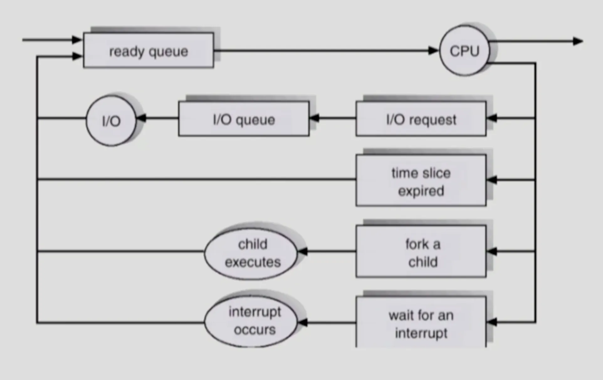 프로그램 시작 → Ready queue → CPU를 얻음 → Interrupt가 걸림 → Ready queue(정확하게 Ready는 아님)