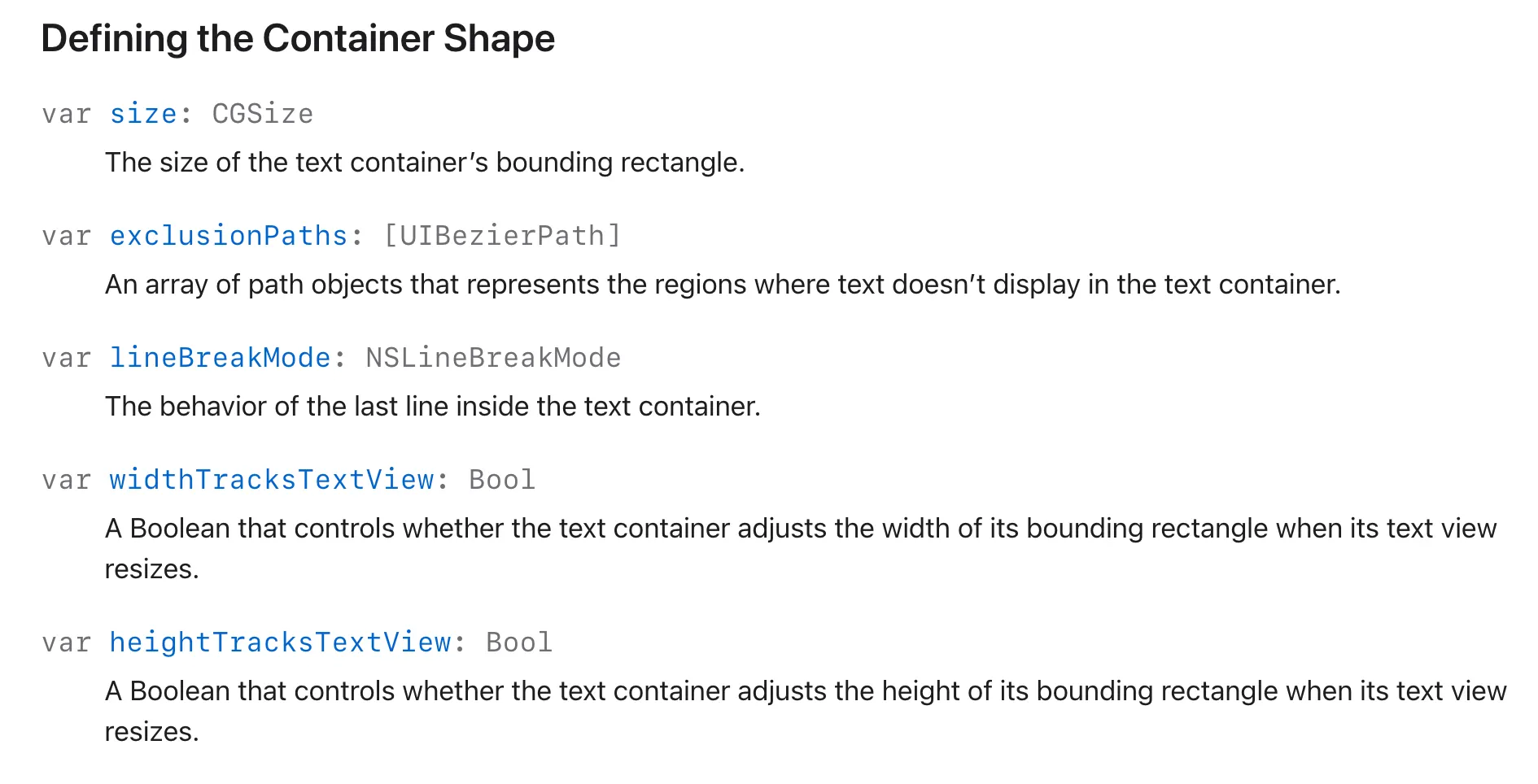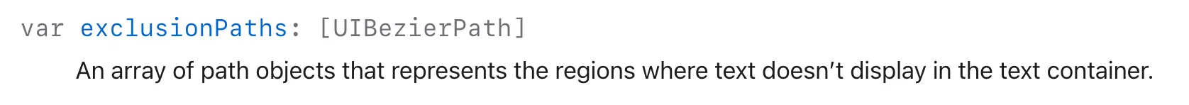 Text Container의 exclusionPaths라는 [UIBezierPath] 타입을 찾았다. 뭔가 여기에 exclusion하고 싶은 path를 넣으면 텍스트가 표시되지 않는 영역이라는 걸 알고서 Rectangle 형식으로 안나오지 않을까?
