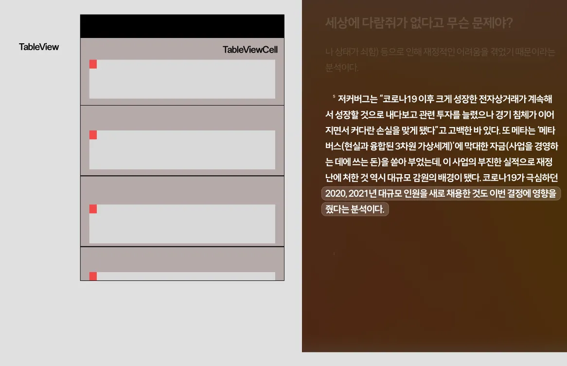 단락 별로 글을 볼 수 있어야 해서 TableView 안에 Cell를 만들어서 단락별로 글이 들어가도록 만듦