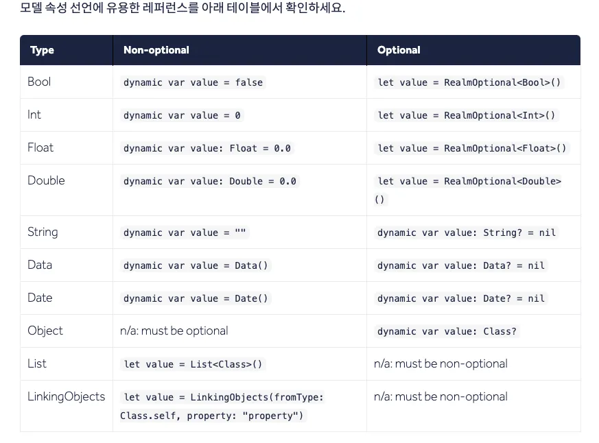dynamic 속성들의 동적 디스패치에 사용되는 Objective‑C 런타임에 표시할 수 없기 때문에 List와 RealmOptional 속성들을 동적으로 정의할 수 없습니다.