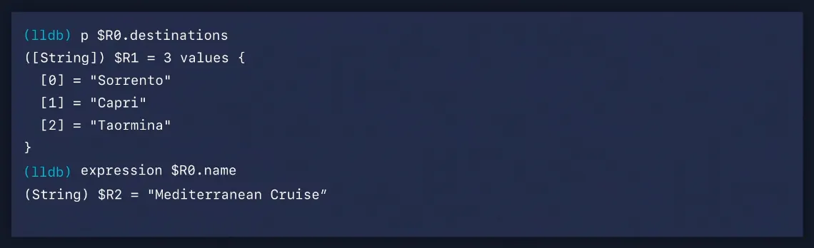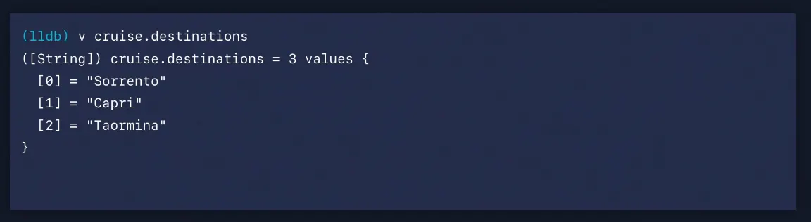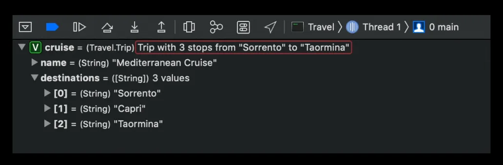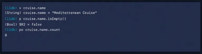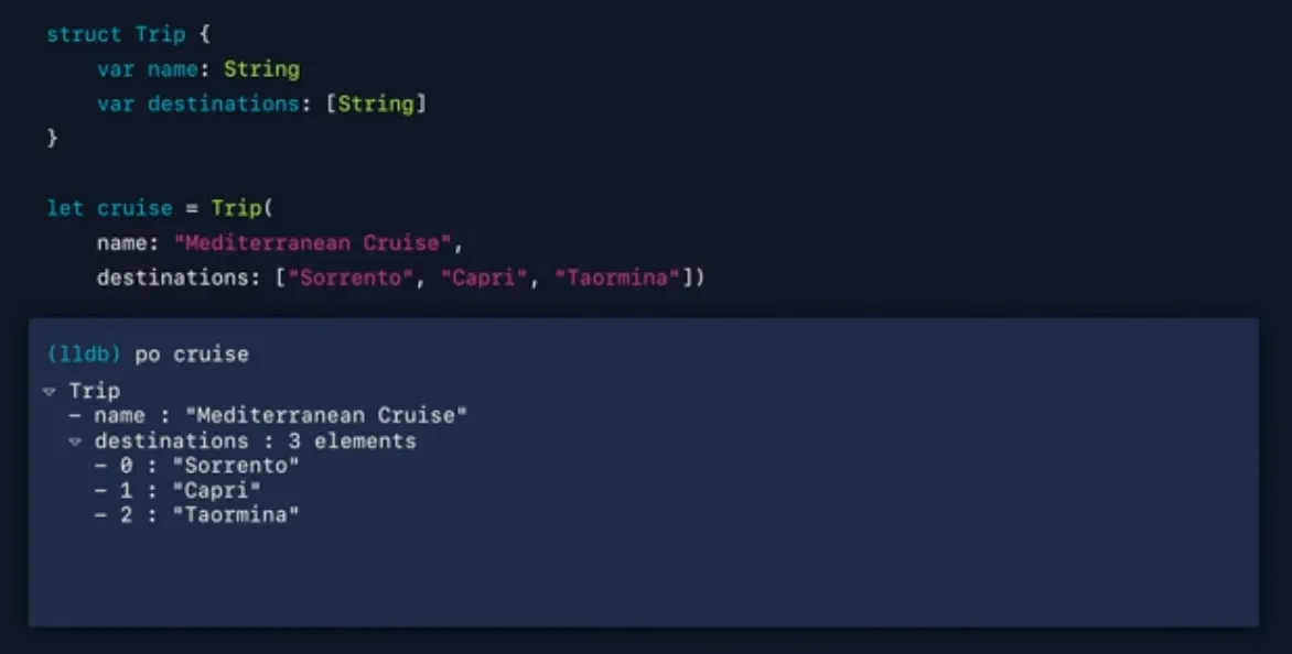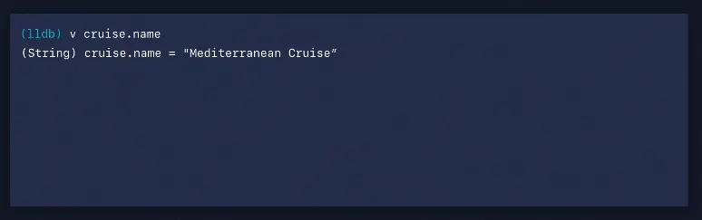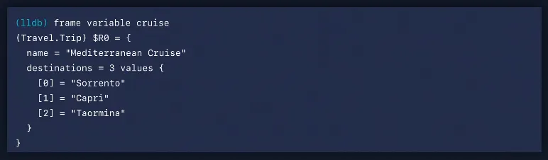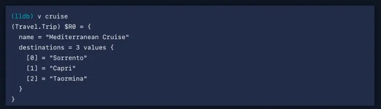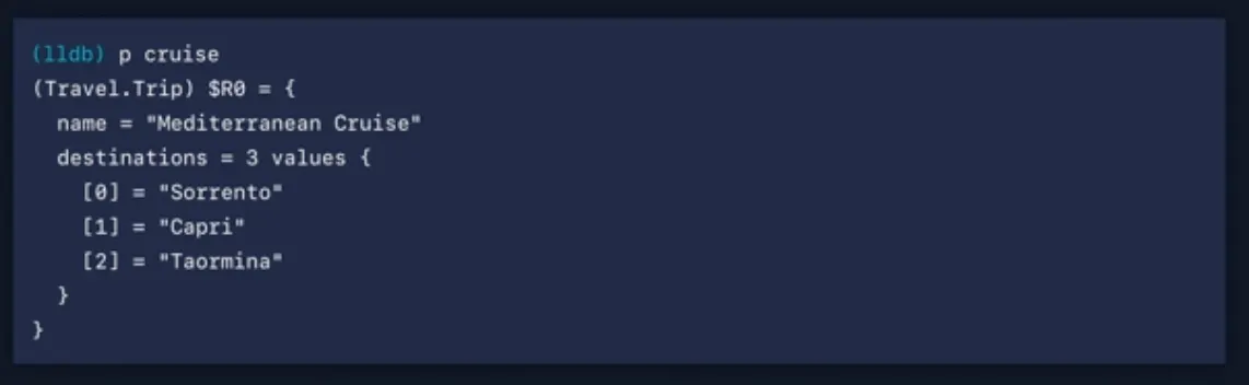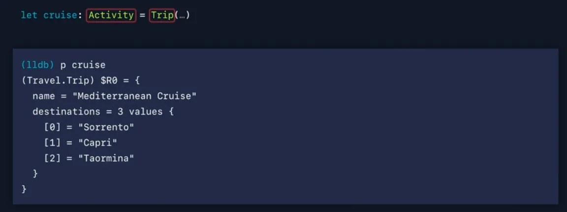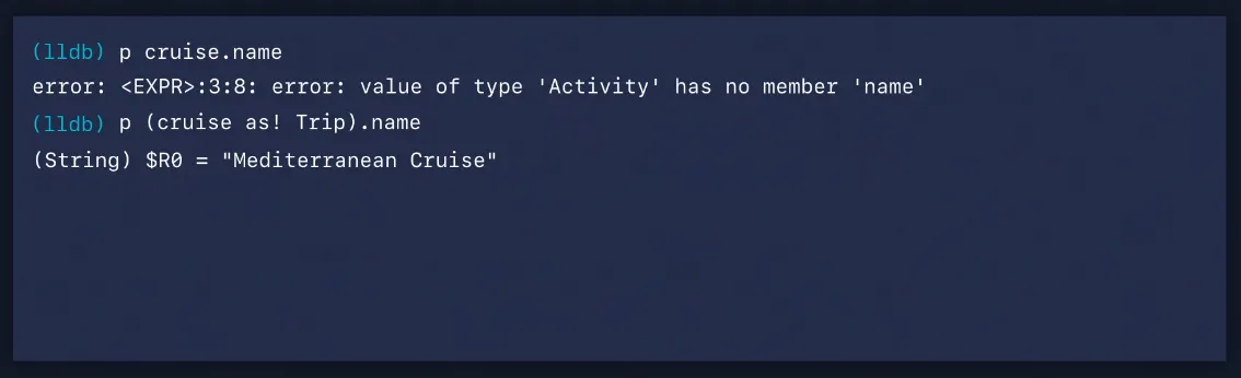 cruise 값을 print하면 LLDB가 주어진 지점에서 주어진 변수에 대한 가장 정확한 타입을 표시하기 위해 결과 메타데이터를 다시 전달하기 때문에 Trip 타입을 얻게 됩니다.