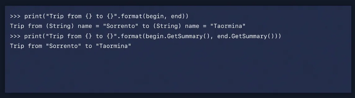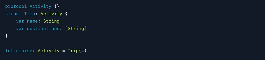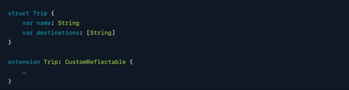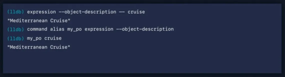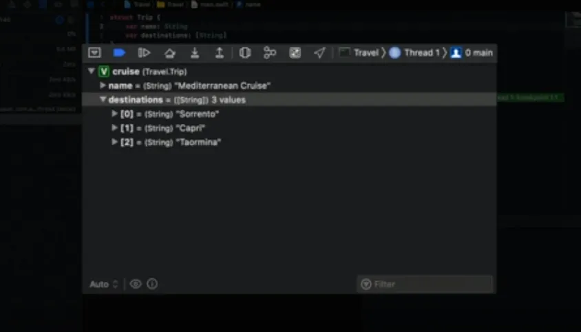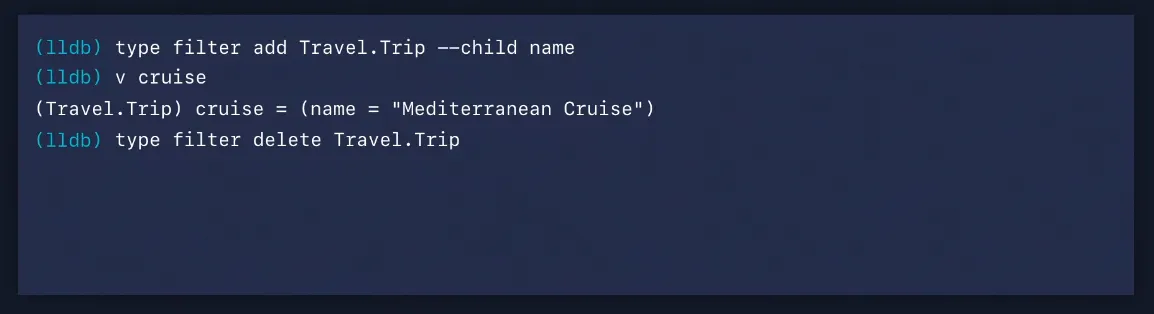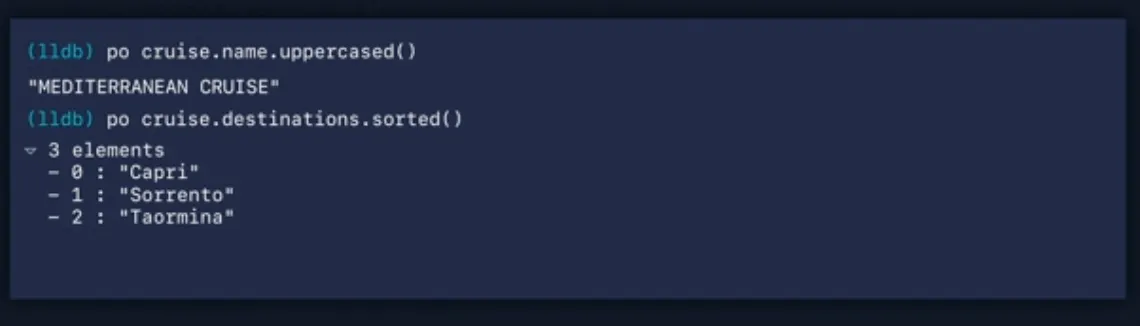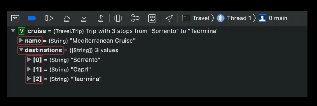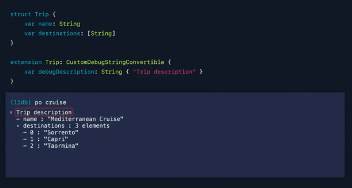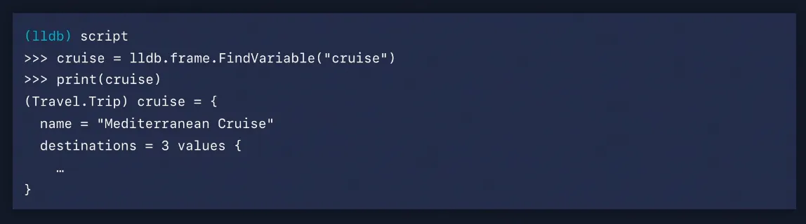 cruise 값을 print하면 LLDB가 주어진 지점에서 주어진 변수에 대한 가장 정확한 타입을 표시하기 위해 결과 메타데이터를 다시 전달하기 때문에 Trip 타입을 얻게 됩니다.