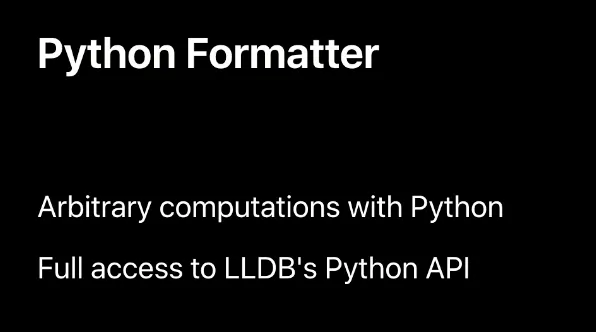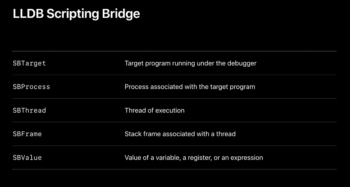임의의 계산을 수행할 수 있으며 현재 디버그 세션 상태에 액세스하기 위한 여러 object를 제공하는 LLDB’s scripting bridge API에 대한 완전한 액세스 권한이 있습니다.