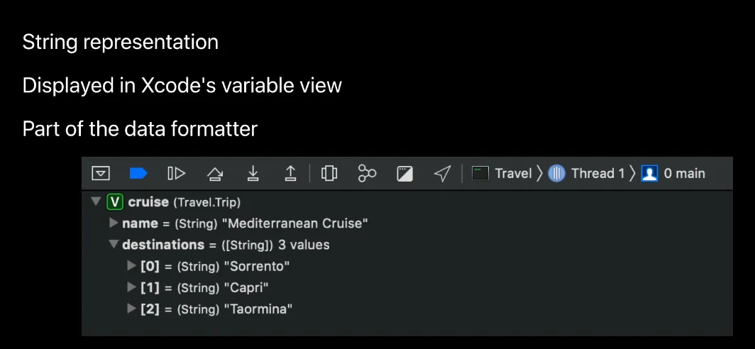 summary는 console에 표시될 뿐만 아니라 Xcode의 variable view에도 표시됩니다.