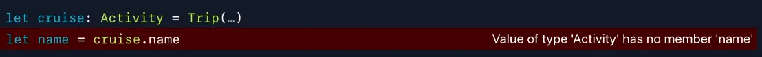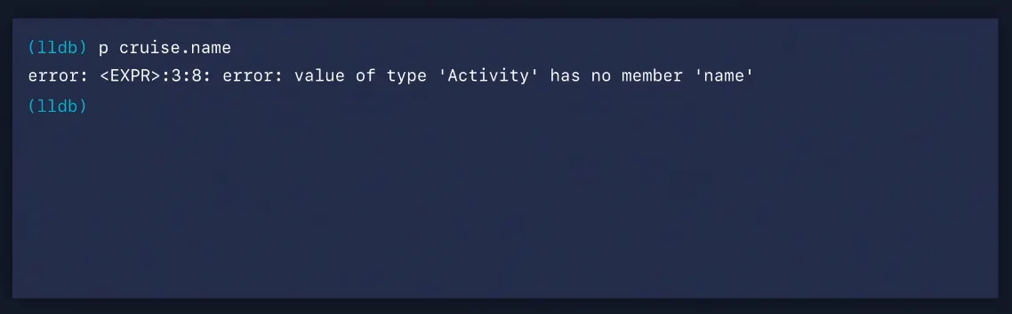 LLDB가 p를 통해 이 식을 평가하려고 할 때 cruise는 Activity 타입의 객체이며 name이라는 구성원을 가지고 있지 않다는 것을 알 수 있습니다. 실패!
