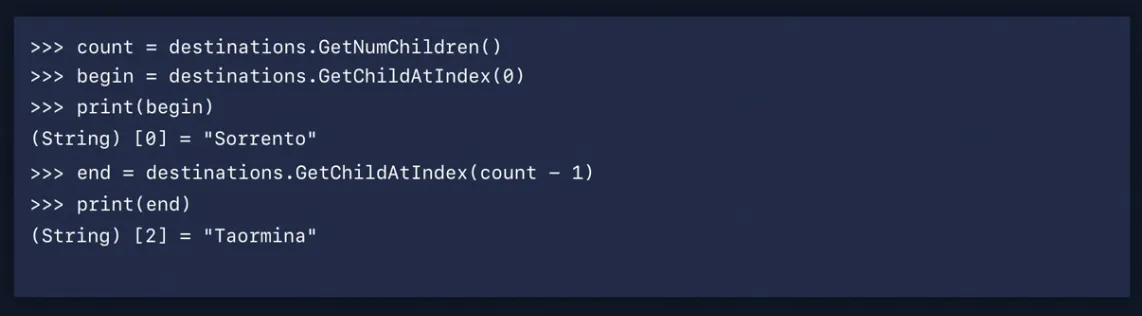 GetChildAtIndex를 사용해서 첫 번째 element와 마지막 element에 액세스할 수 있습니다.